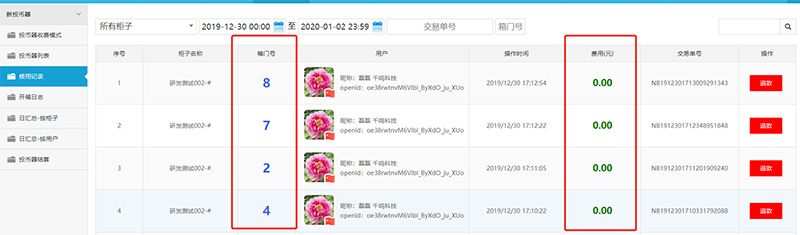 5. 可以查看存取记录,存取微信的昵称、头像,箱门号及费用。